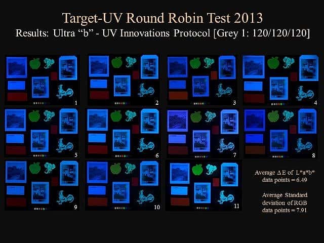 When you see how different the images are when there are no reference standards, it is easy to see the critical need for this project. The Target-UV Round Robin Test shows how varied the results are when you take the images just using your own judgment. This is fine for the one-off photograph, but not valuable if you are comparing images with other labs or if you want to compare an image to one that was taken ten years ago.