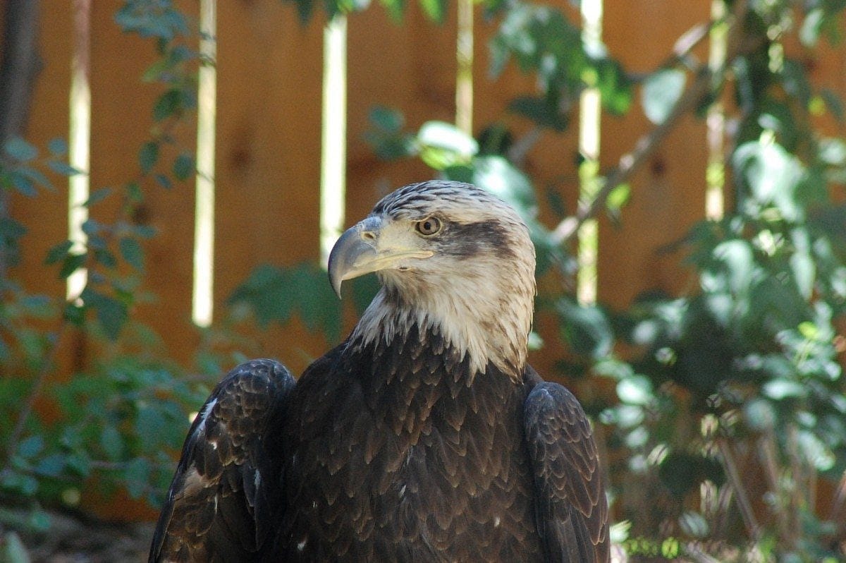This whole topic is super fun to talk to our visitors about, and it makes our jobs interesting, too. That’s because we really do not know for sure whether some of our birds are male or female! As I mentioned earlier, unless a raptor fits into the exceptions (like Salem the American Kestrel – we know he is a male because he has the gray-blue on his wings), the only way to know for sure is to do a surgery or blood test…or unless they lay eggs, which our Golden Eagle Kateri has done for a couple of years now! For everyone else, we have had to make our guess based on their size! As with anything, there is always a chance for mistakes, which is why we thought our Bald Eagle, Jade, was male for many years. Bald Eagle weights generally range between 8-13 pounds. Jade has weighed as low as eight pounds and as heavy as 13 pounds according to our scale but is quite a bit smaller than our known female Golden Eagle. So, we went with male until a blood test confirmed, without a doubt that Jade is a female. Regardless of whether they are female or male, all of our birds are excellent ambassadors for their species!
