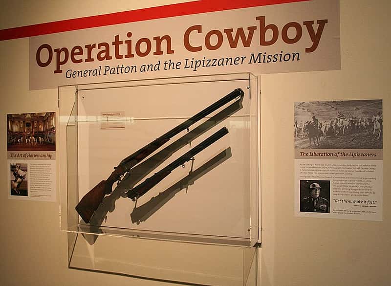 A new exhibit, Operation Cowboy, is now on display at the Cody Firearms Museum (CFM) of the Buffalo Bill Center of the West and relates this remarkable story. In 1945, the U.S. Second Cavalry under General George S. Patton learned of a number of stolen Lipizzaner horses held captive by German lines in Hostau, Czechoslovakia. In addition to the hundreds of horses, there were also a large number of Allied prisoners of war (POWs). The exhibit tells of the Second Cavalry’s rescue of the horses and prisoners.