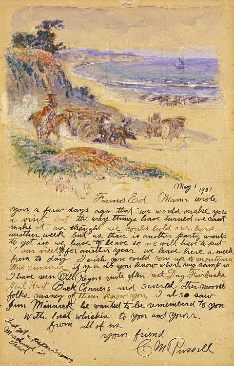 Russell wore many hats. He was an artist, writer, cowboy, storyteller, and an advocate for American Indians. He was also a fabulous pen pal! Russell regularly wrote and illustrated letters to family, friends, patrons, and fellow artists. His letters are unique in that he created a sketch first – often in watercolor or ink – and then composed a narrative around the illustration. Without these personalized sketches, Russell’s letters would certainly be less extraordinary. But because of the unique nature of his illustrated letters, Russell’s notes have been viewed as works of art in their own right, and have therefore survived the years, offering historians a better understanding of their author.