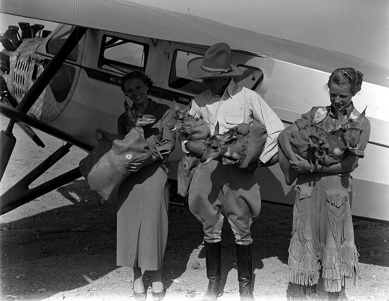 From the rangelands of the famous Pitchfork Ranch southwest of Cody, Wyoming, pilot Bill Monday flies young pronghorn to zoos throughout the country, 1930 – 1939.