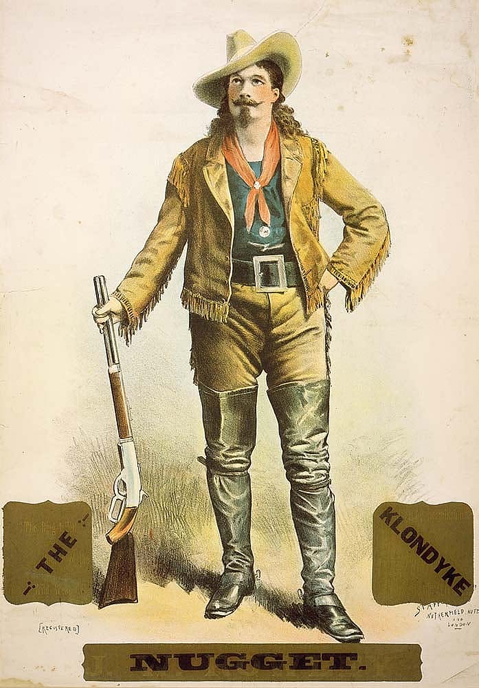 By 1898, S.F. became interested in melodramas and produced a five-act play he called The Klondike Nugget, capitalizing on the gold rush in the Yukon Territory that began a year earlier. While this aspect of his invented autobiography lent authenticity to the plot, it seems unlikely that he ever travelled to Alaska, let alone prospected for gold there. In this play, the extravagant set designs depict everything from a mine shaft to a collapsing bridge. According to author Kuntz, the audience was enthralled by the sets but probably cared little for the plot. To publicize this play, Cody created a poster patterned after one of William F. Cody’s posters for the Wild West by replacing Buffalo Bill’s head with his own. S.F. even had the audacity to stage The Klondike Nugget in some of the same towns and at the same time where Buffalo Bill’s Wild West was appearing.