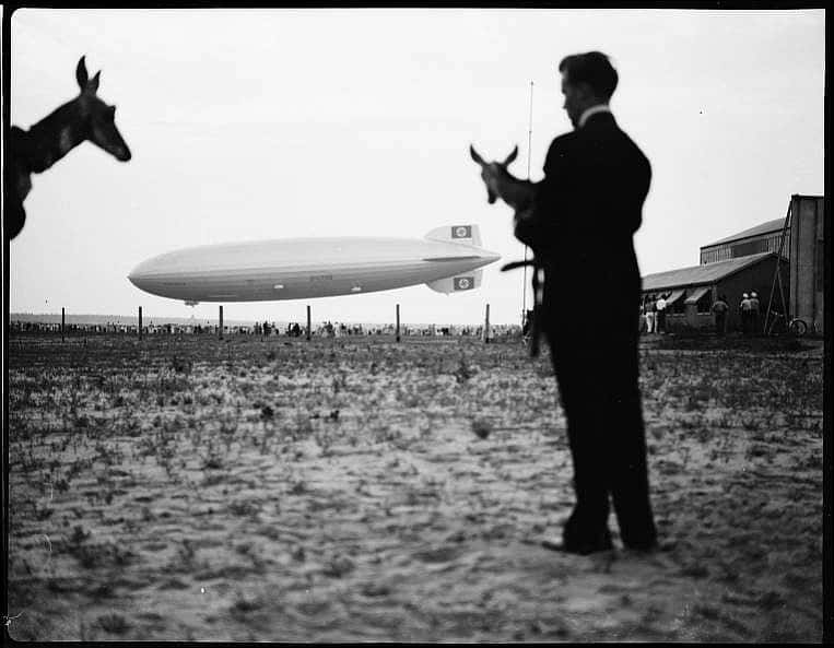The Pitchfork antelope caper seized the public attention. People were charmed by photos of airline stewardesses bottle feeding baby antelope. With the ability to run sixty miles an hour, catching adult antelope wasn’t practical. Adult antelope couldn’t handle captivity, either. The fawns, many caught when they were a couple hours old, were happy enough on warm cow’s milk, and later, oatmeal. When it came time to sell the fawns, it was too difficult to secure milk for a train trip of that length, so Belden turned to airplanes and the local pilot, Bill Monday. Flying at 10,000 feet so the antelope wouldn’t get hot, they stood the trip well, particularly since they were let out at various stops to romp around in airplane hangars. Zoos in St. Louis, The Bronx, Chicago, and other locations purchased Belden’s charges. But the most notable was when some of them got on the Hindenburg.