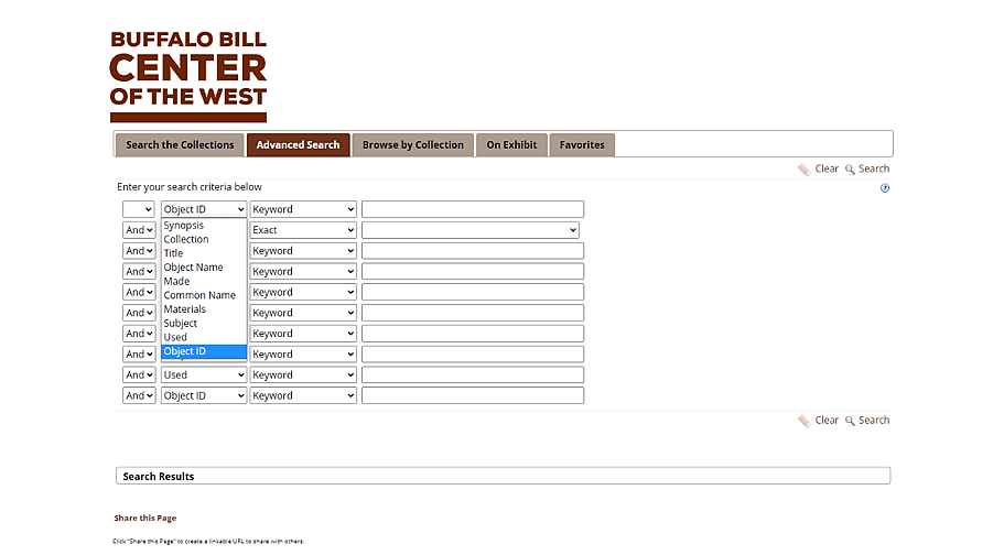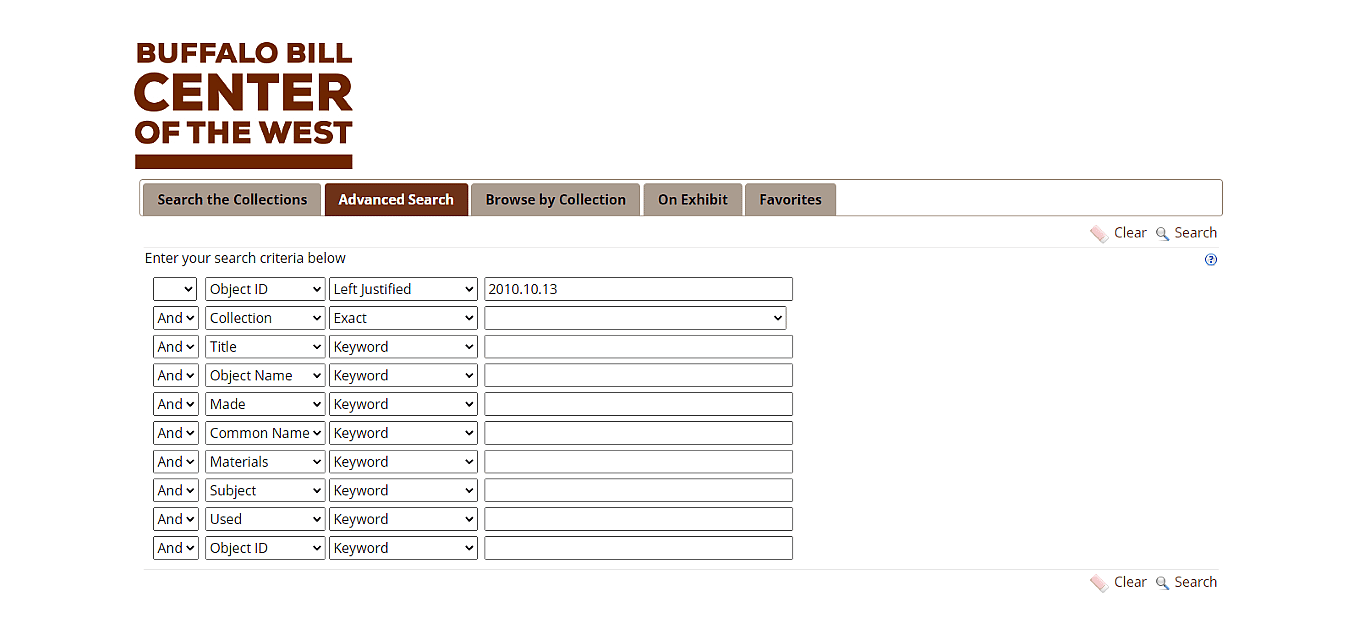 - Collection – This allows you to search within one of the museum collections, using their abbreviations: Buffalo Bill Museum (BBM), Cody Firearms Museum (CFM), Draper Natural History Museum (DNHM), Plains Indian Museum (PIM), Whitney Western Art Museum (WWAM)