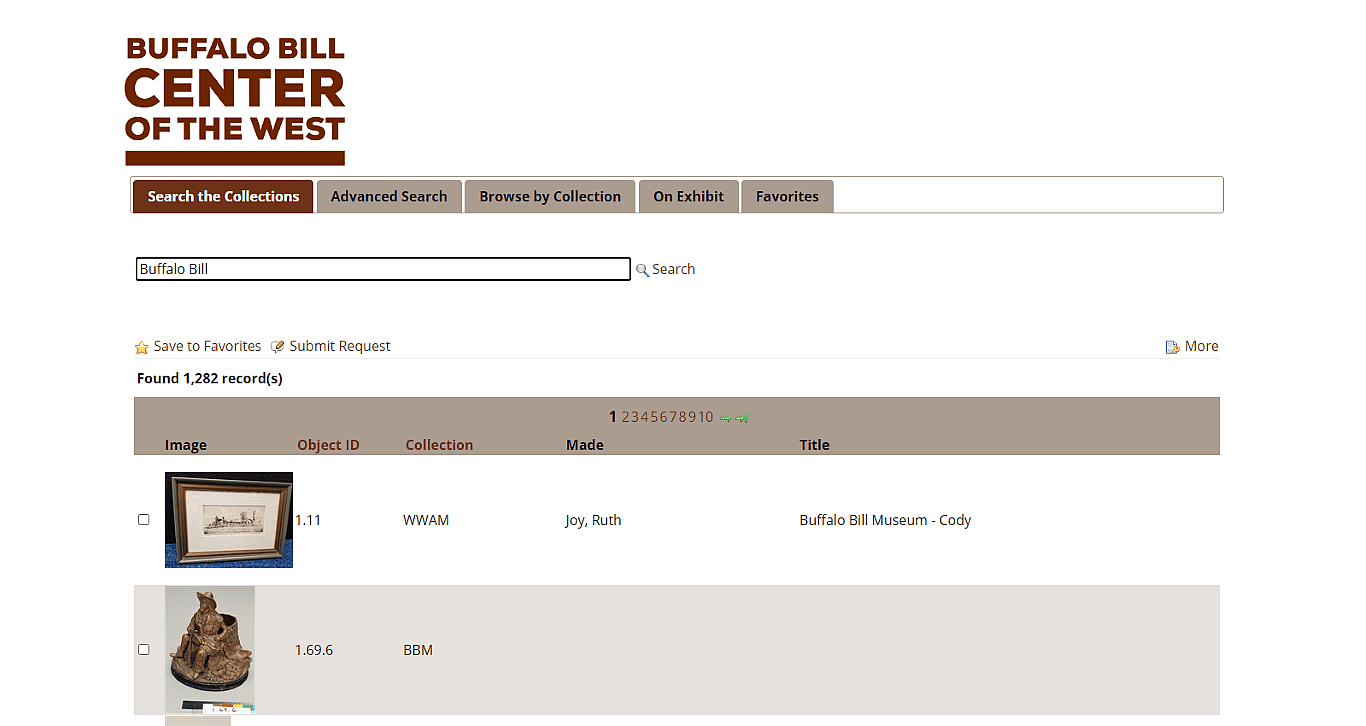 This will bring you to the public collections database homepage. From here, you can use the search bar to look for keywords found in the object records. In this instance, searching “Buffalo Bill” brings up 1,282 records.