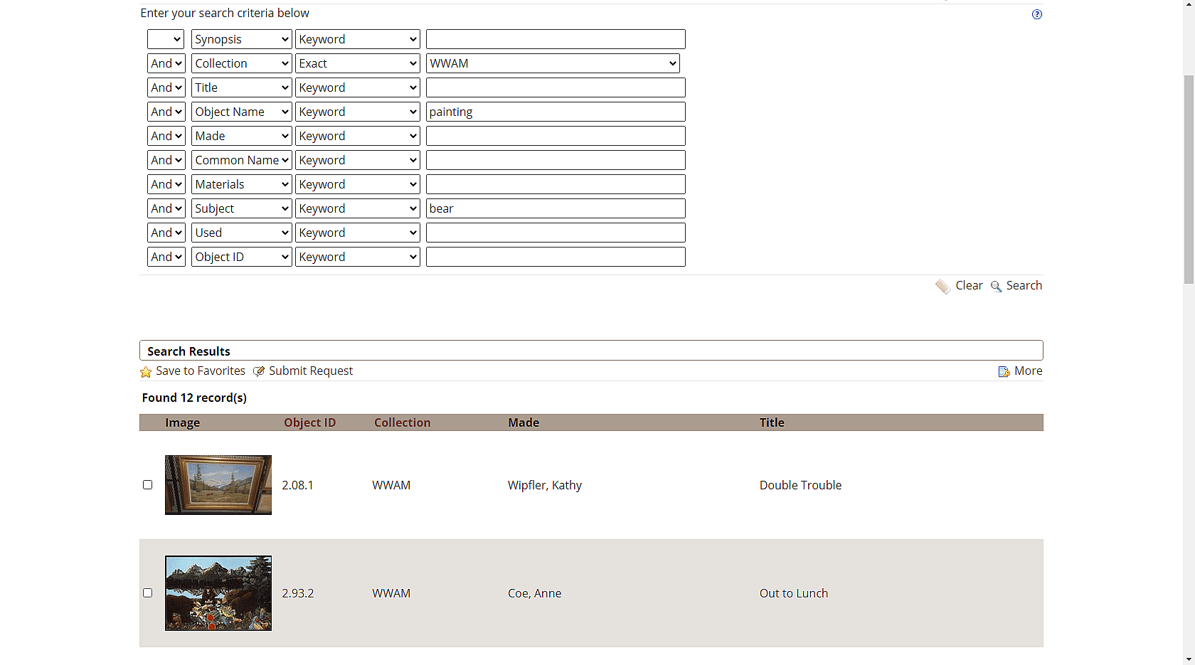 Let’s say you went to the Whitney and saw a painting you really liked, but you can’t remember the artist name or what it was called. You do know that it was a painting with a bear, and it was in the Whitney. In the Collection search field, put “WWAM”. For Object Name, put “painting,” and for Subject, put “bear.”