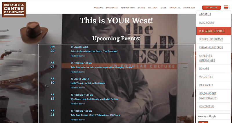 First, you have to find your way to the online collections. From the Buffalo Bill Center of the West homepage, click on the “Research and Explore” tab, as shown below.