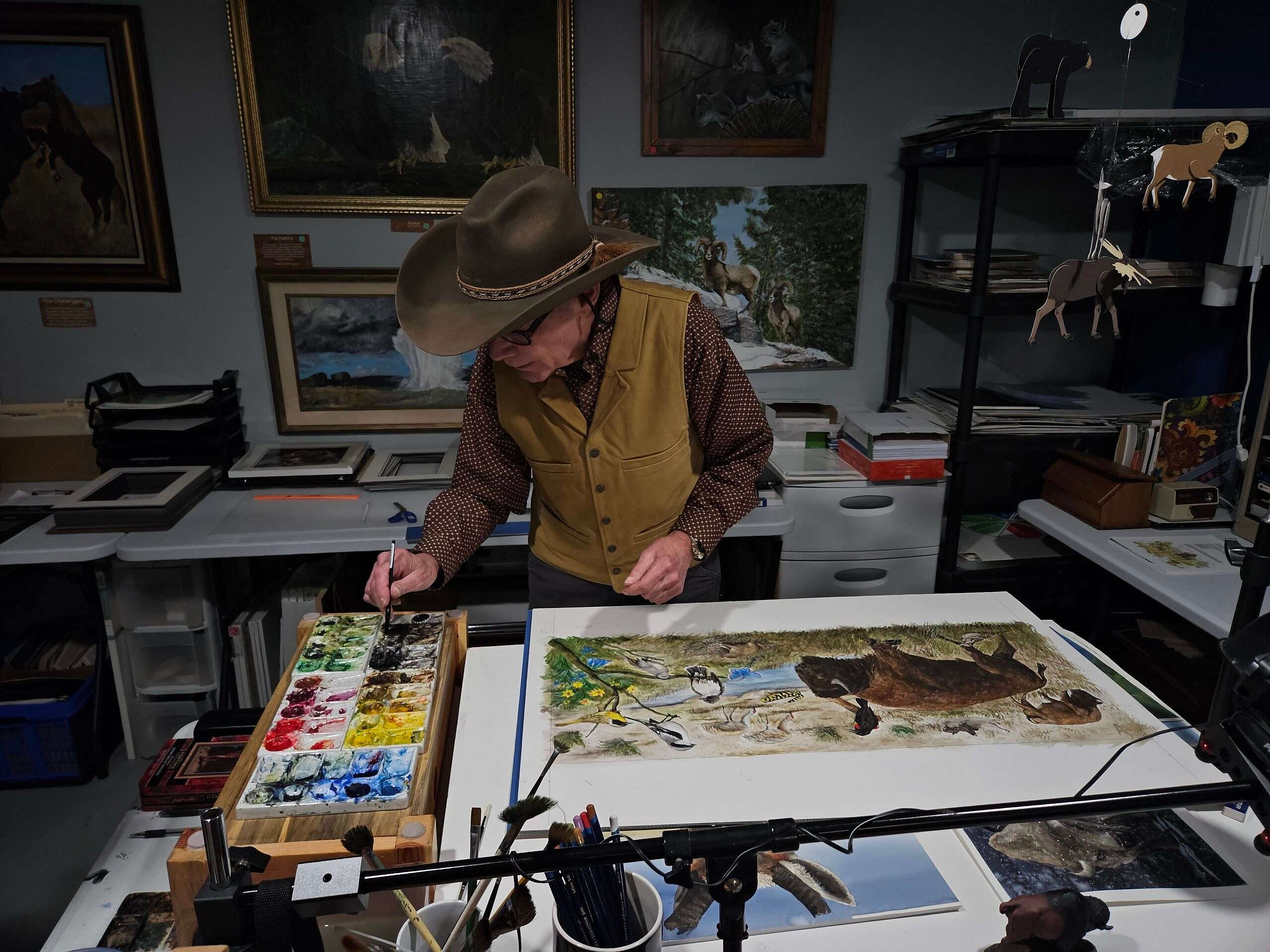 Notice the wildflowers in the artwork. A 2016 study found that yarrow (Achillea millefolium), alpine arnica (Arnica alpina), and tall bluebells (Mertensia paniculata) are all found in higher frequencies at bison wallows, even wallows that have been abandoned for many years. Wildflowers are important food sources for pollinators. In winter, some wildflower seeds are a source of food for songbirds.