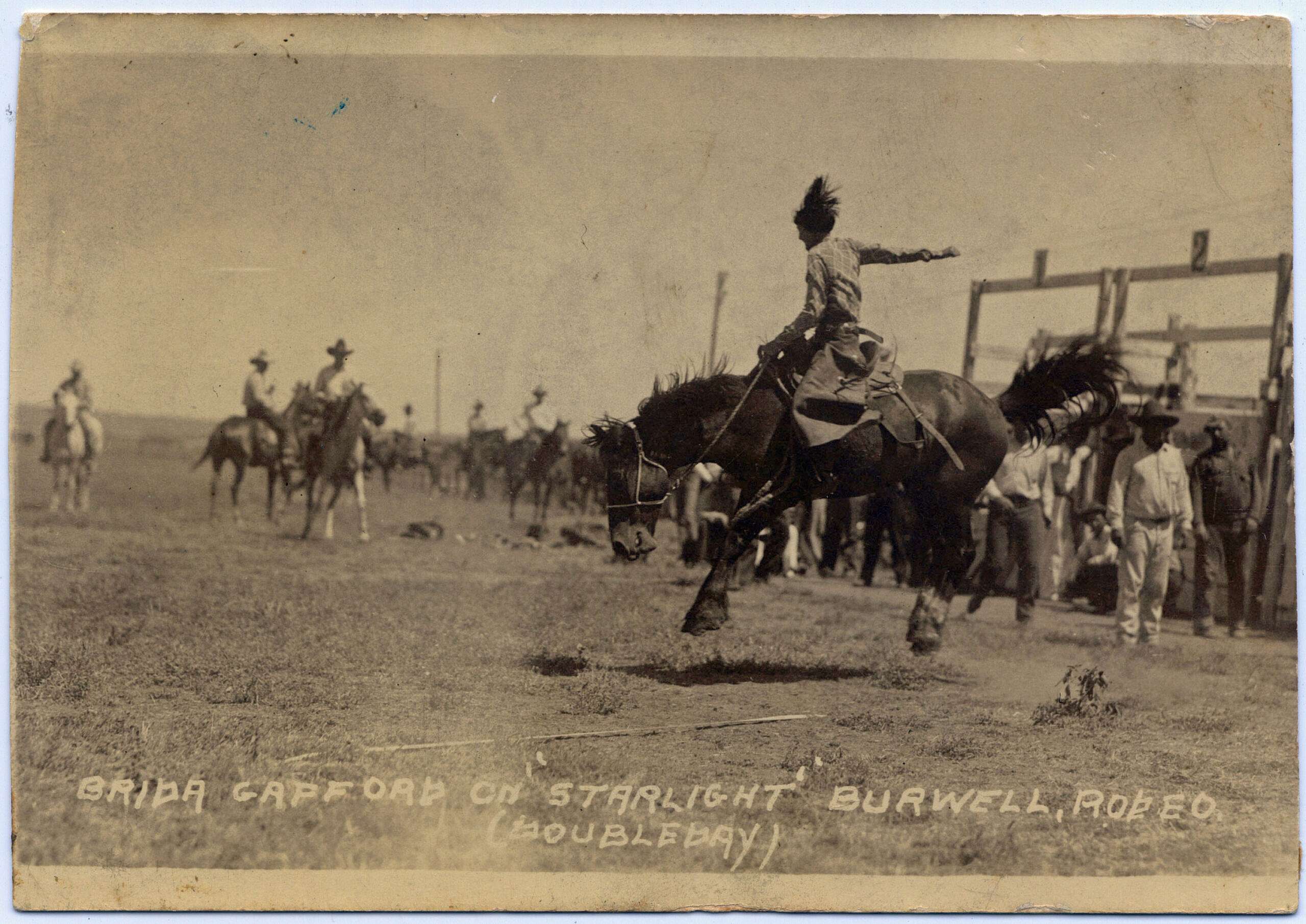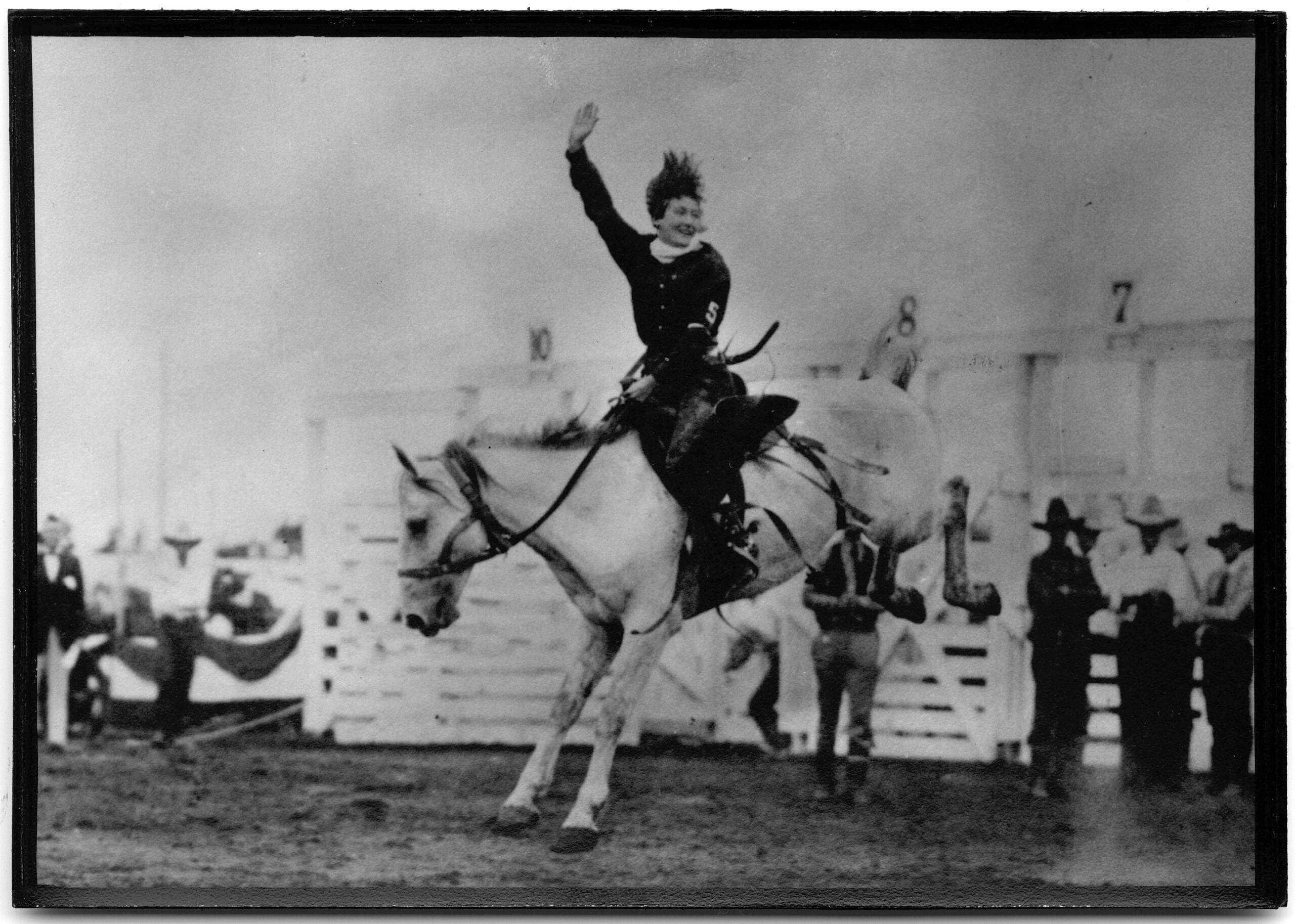 Removed from urban influences, women like Brida Gafford saw themselves as athletes, not advocates for social change. Apolitical, they seemed to take no notice of issues of the day like the women’s suffrage movement, or the battle for the prohibition of alcohol. In early pictures of female rodeo contestants, they are generally smiling broadly and the relish they take in their physical existence seems to peel off the page. Photos of Brida astride a bucking bronco show her laughing happily.