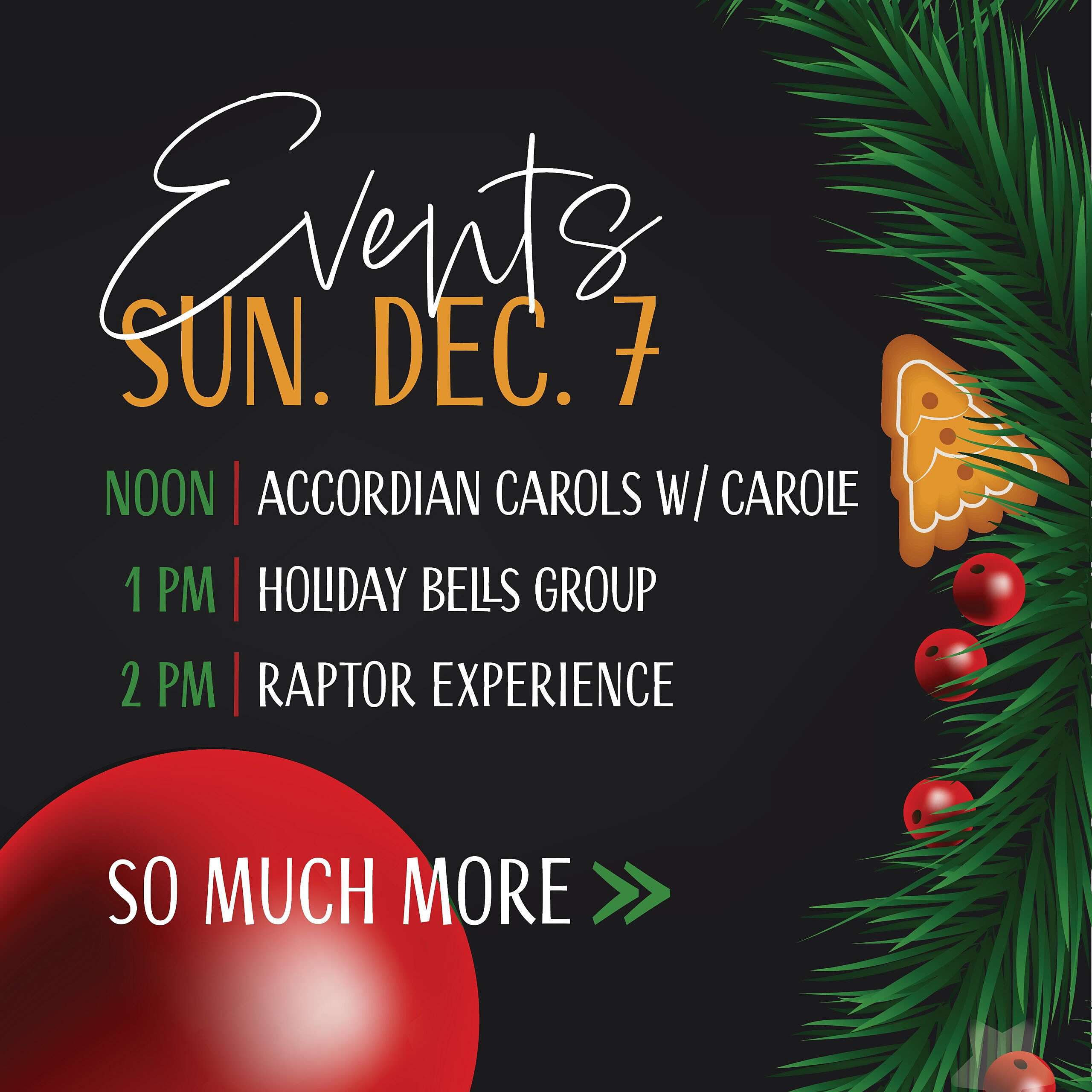 Families are encouraged to share the holiday spirit by contributing to the collection boxes stationed at the front door entrance. Bring non-perishable food items; they will be distributed through local food pantries. Bring new, packaged toys; they will be distributed through Holiday Helpers.