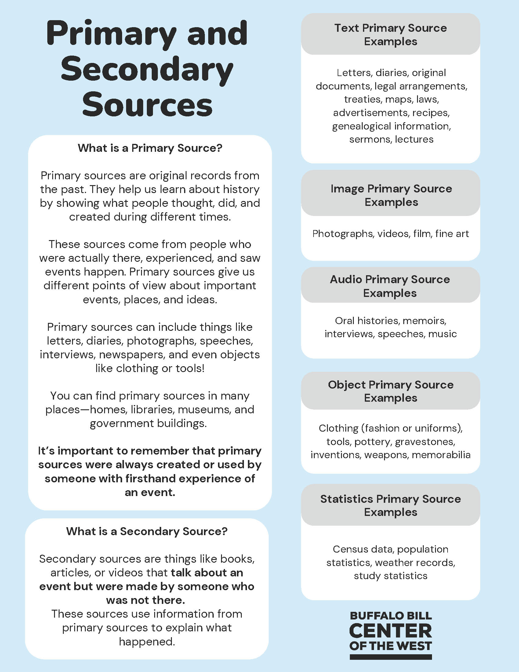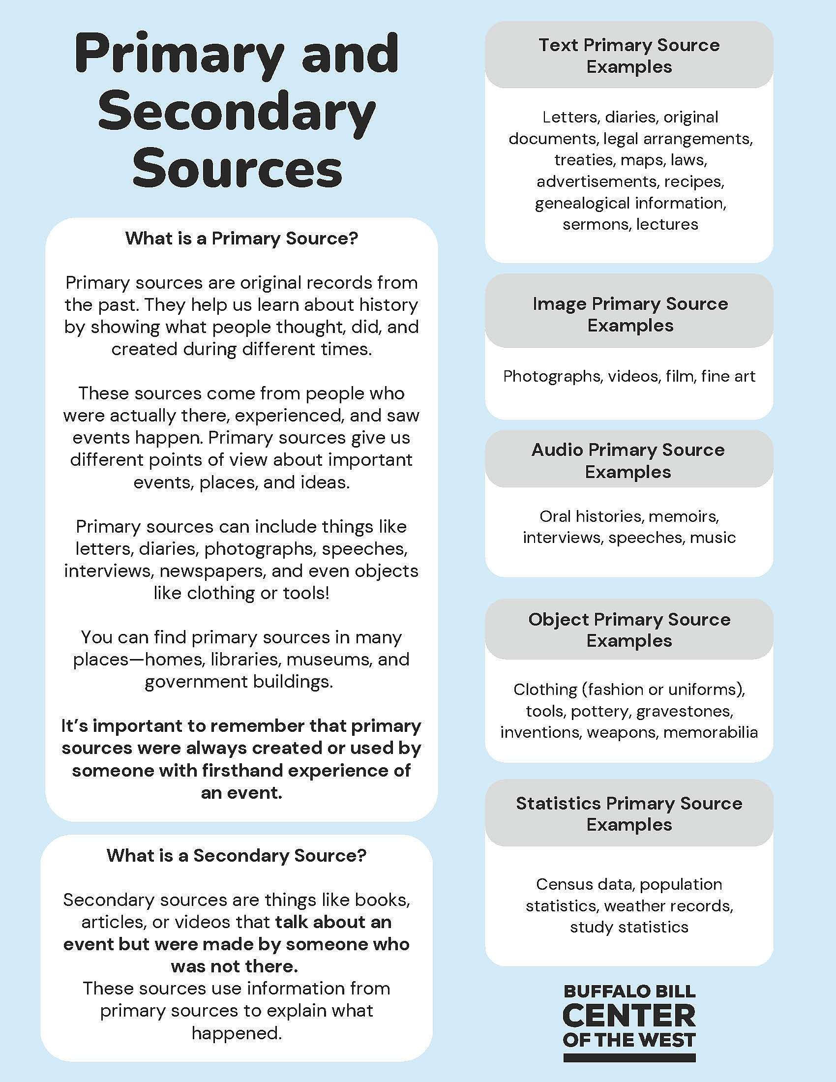 Center Archivist Cassandra Day created this handout resource to help students understand the difference between primary and secondary sources.